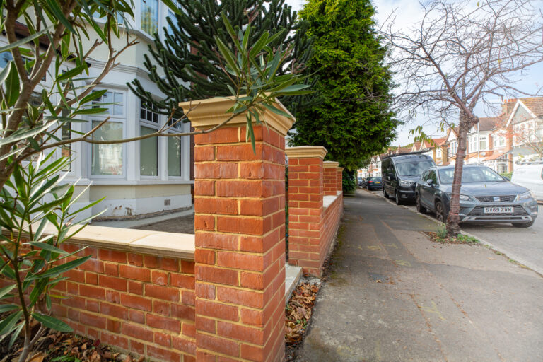 Red brick garden wall with sandstone coping caps.